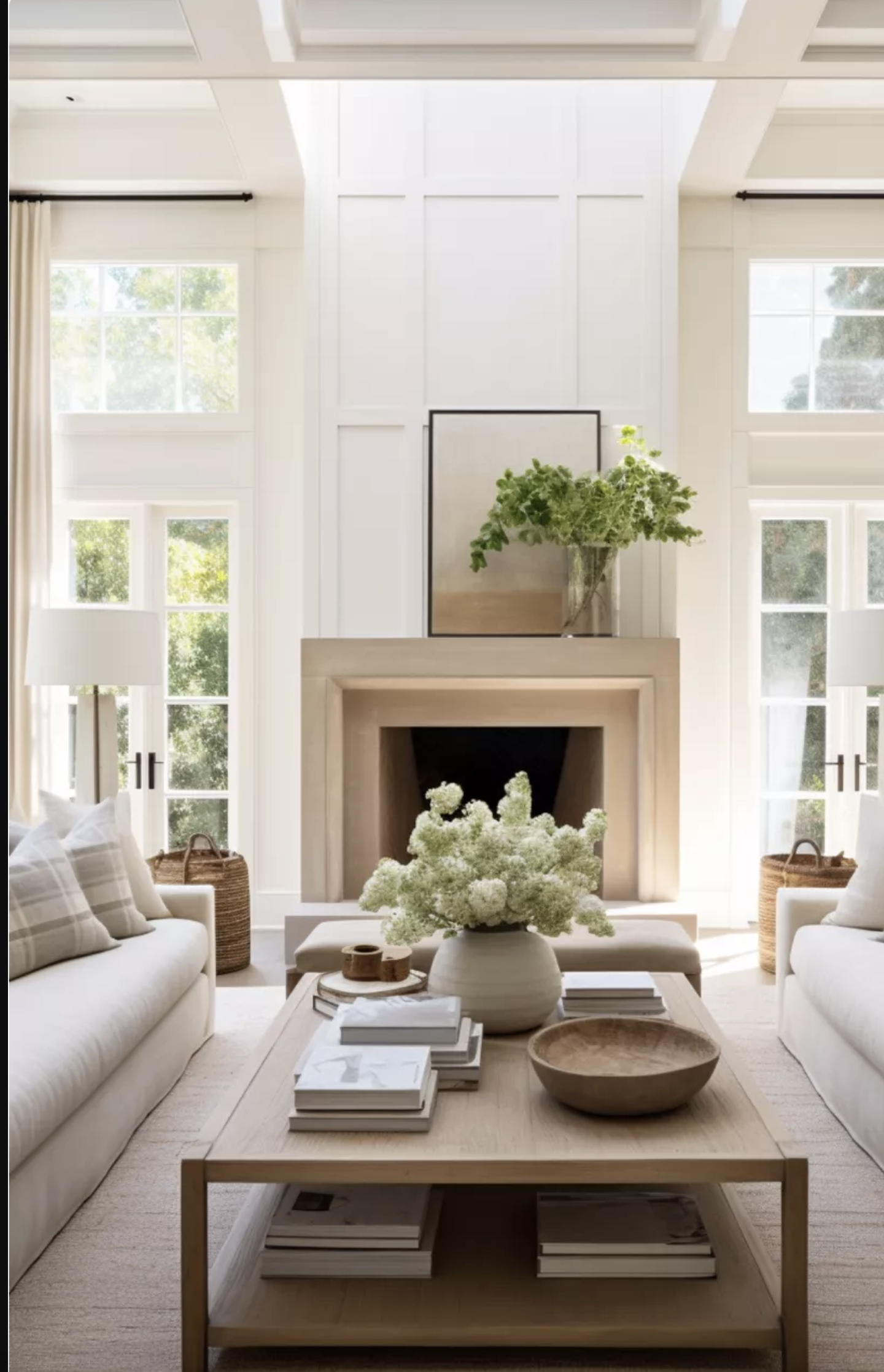 Everything neutral browns, beiges and whites except black finishes, greenery in the form of plants, and small accessories